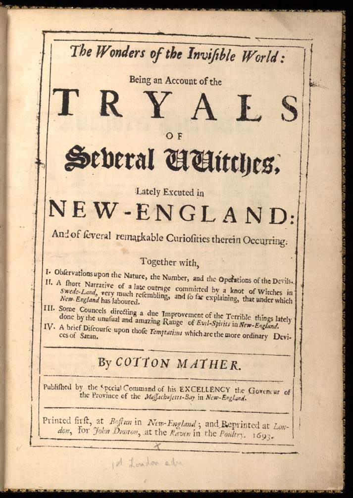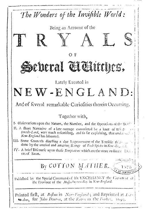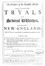 The Wonders of the Invisible World: View Pages in PDF Format [ Pages 1 - 50 ] [ Pages 51 - 100 ] [ Pages 101 - 112 ] And this copy from the University of Virginia Unabridged edition The wonders of the invisible world : being an account of the tryals of several vvitches, lately excuted [!] in New England : and of several ... Printed first, at Bostun [!] in New-England ; and reprinted at London : for John Dunton, 1693. 112pp. Notes: Paging irregular. The last leaf sig. [R2] contains advertisement of "books lately printed for John Dunton." Typography and style of head-lines vary. Recto of first prelim. leaf half-title: The tryals of several vvitches, lately executed in New-England: published by the special command of the Governour. On verso: Imprimatur. Decem. 23. 1692. Edmund Bohun. The author’s defence, p. [1-2] [Letter from William Stoughton, p. [3]; prefatory note by Mather, p. [4]] Enchantments encounter’d, p. 5-[17] A discourse on the wonders of the invisible world; uttered (in part) on August 4, 1692: p. 2-16, 33-80, 41-56, 89-98. First London edition. A 2d edition, greatly abridged, was published, London, J. Dunton, 1693, 62 p., and a 3d edition, London, J. Dunton, 1693, 64 p. |