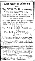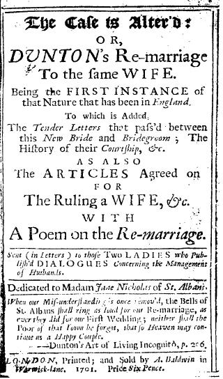 wife. View Pages in PDF Format [ Page 1 - 50 ] [ Pages 51 - 75 ] The case is alter'd: or, Dunton's re-marriage to the same wife. Being the first instance of that nature that has been in England. To which is added, the tender letters that pass'd between this new bride and bridegroom; the history of their courtship, by John Dunton, printed and sold by A. Baldwin, London, 1701., 75 pages. Notes: Dedication to his mother-in-law, Mrs. Jane Nicholas, signed: John Dunton. |