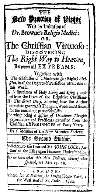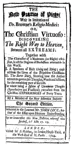 'Religio bibliopolae' View Pages in PDF Format [ Pages 1 - 50 ] [ Pages 51 - 100 ] The new practice of piety: writ in imitation of Dr. Browne’s Religio medici: or, the Christian virtuoso: ... Together with I. The character of a moderate (or right) Christian, ... II. A specimen of holy living and dying; ... III. The secret diary, ... By a member of the New Athenian Society: the second edition. Dedicated to ... Mr. John Lock, ... London, printed for S. Malthus, 1704. 100 pages. |