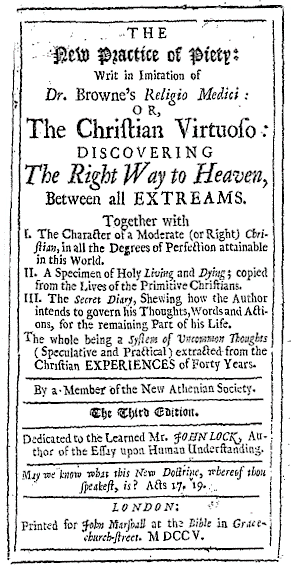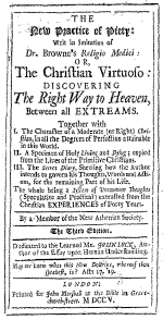 way to heaven, between all extreams. View Pages in PDF Format [ Pages 1 - 50 ] [ Pages 51 - 100 ] [ Pages 101 - 115 ] The new practice of piety: writ in imitation of Dr. Browne’s Religio medici: or, the Christian virtuoso: discovering the right way to heaven, between all extreams. ... By a member of the New Athenian Society. The third edition London, printed for John Marshall, 1705. 115 pages. Notes: The dedication signed: H. N. An enlarged edition of John Dunton’s ’Religio bibliopolæ’. Text continuous despite pagination. With two final advertisement leaves. |