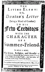 The living elegy: or, Dunton’s letter (being a word of comfort) to his few creditors: with the character of a summer-friend. View Pages in PDF Format [ Pages 1 - 50 ] [ Pages 51 - 67 ] The living elegy: or, Dunton’s letter (being a word of comfort) to his few creditors: with the character of a summer-friend. To which is added, the lives, religion, and honesty of the Moderator, Wandering Spy, Rehearsal, London C-d (alias post) Interloping Whipster, and the other attachers of my person and goods. London, 1706. Page 67. Notes: In: ’Dunton’s whipping post: or, a satyr upon every body’. |