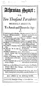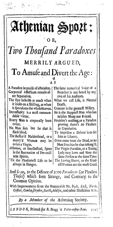 Pages 151 - 200 ] Athenian sport: or, two thousand paradoxes merrily argued, to amuse and divert the age: ... By a member of the Athenian Society, printed for B. Bragg,London, 1707. Notes: Preface signed: Philaret, i.e. John Dunton. With a half-title, 576 pages. |