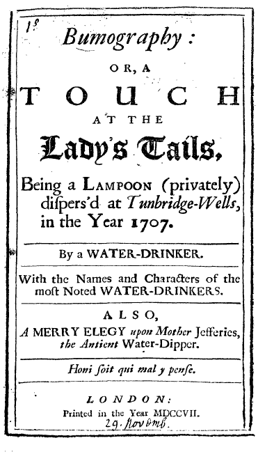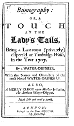 touch at the lady’s tails, being a lampoon (privately) View Pages in PDF Format [ Pages 1 - 50 ] [ Pages 51 - 83 ] Bumography: or, a touch at the lady’s tails, being a lampoon (privately) dispers’d at Tunbridge-Wells, in the year 1707. By a water-drinker. With the names and characters of the most noted water-drinkers. Also, a merry elegy upon Mother Jefferies, the antient water-dipper. London, printed in the year MDCCVII. [1707]. 83 pages Notes: The introduction signed: Tom - The Water-Drinker, i.e. John Dunton. Text and register from page vi to page v are continuous despite duplicated pagination. Copy filmed at UMI microfilm Early English Books, Tract Supplement reel E3 a fragment with title page only. |
