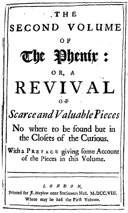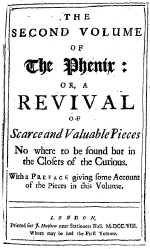 251 - 300 ] The phenix: or, a revival of scarce and valuable pieces from the remotest antiquity down to the present times. ... By a gentleman who has made it his business to search after such pieces ... Vol. 2. London, printed for J. Morphew, 1707-08. 2 vols. 569 pages. Notes: A gentleman = John Dunton, the editor. The title page to volume 2 reads 'The second volume of The Phenix: ..'. Tract VIII in Vol. 1: "John Keymore's observations made upon the Dutch fishing..." (Goldsmiths' 4385) only, filmed on RPI microfilm set "Goldsmiths'-Kress", reel no. 263. |