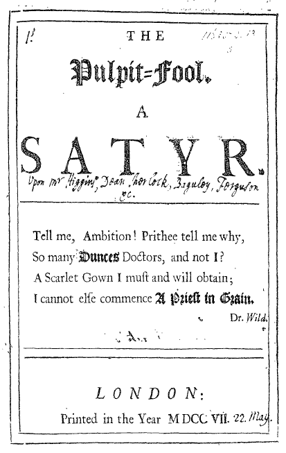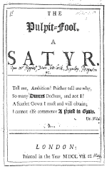 The pulpit-fool. A satyr. View Pages in PDF Format [ Pages 1 - 50 ] [ Pages 51 - 75 ] The pulpit-fool. A satyr. London, 1707. 75 Pages. Notes: Anonymous. By John Dunton. |