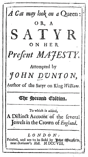 Her present Majesty. [ Pages 1 -50 ] [ Pages 51 - 88 ] A cat may look on a Queen: or, a satyr on Her present Majesty. Attempted by John Dunton, author of the Satyr on King William. The second edition. To which is added, a distinct account of the several jewels in the crown of England. Printed, and are to be sold by John Morphew, London, 1708. 88 pages |