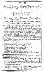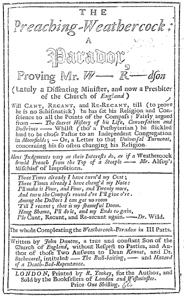 Mr. William Richardson, from near an hundred aspersions that are cast upon him High-church: or a vindication of the Reverend Mr. William Richardson, from near an hundred aspersions that are cast upon him, by Mr. John Dunton, in his paradox intituled The preaching weather-cock. ... In a letter to Doctor Calamy ... London, printed by R. Tookey (for the author) and sold by J. Baker, 1712. Notes: Signed at the end: J.H., i.e. John Dunton?. An attack on William Richardson. 37 pages. |