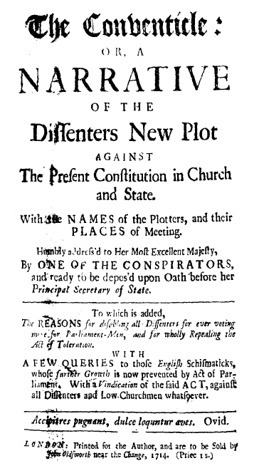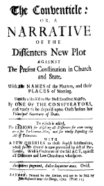 Humbly address’d to Her ... Majesty View Pages in PDF Format [ Pages 1 - 50 ] [ Pages 51 - 99 ] The conventicle: or, a narrative of the dissenters new plot against the present constitution in church and state. ... Humbly address’d to Her ... Majesty, by one of the conspirators, ... London, printed for the author, and are to be sold by John Oldsworth, 1714. Notes: Prefaced by: ’High-church loyalty: or, the secret history of the anti-schismaticks’, signed on p.27: Philaret, i.e. John Dunton. 99 pages. |