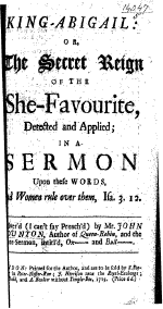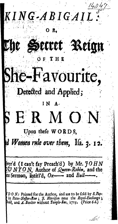 King-Abigail : or, the secret reign of the she-favourite, detected and applied Click Here to View in PDF Format King-Abigail : or, the secret reign of the she-favourite, detected and applied; in a sermon ... Deliver’d ... by Mr. John Dunton, ... London, printed for the author, and are to be sold by S. Popping; J. Harrison; A. Dodd, and A. Boulter, 1715. 32 pages. Notes: With four final leaves listing Dunton’s works. The she-favourite = Abigail Masham. |