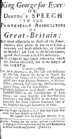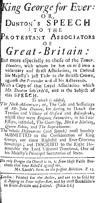 | King George for ever: or, Dunton's speech to the Protestant associators of Great-Britain: but more especially to those of the Tower-Hamlets View Pages in PDF Format [ Pages 1 - 50 ] [ Pages 51 - 76 ] King George for ever: or, Dunton's speech to the Protestant associators of Great-Britain: but more especially to those of the Tower-Hamlets, ... To which is added, The neck-adventure; or, the case and sufferings of Mr. John Dunton, ... London, printed for the author, and are to be sold by S. Popping, and by most booksellers in Great-Britain and Ireland, [1715?]. 76 pages. Notes: The second part, pp.[i]-xxiv, contains 'The neck-adventure', with its own titlepage, dated 1715, register and pagination, which was also available separately. | |||