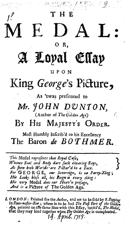 The medal: or, a loyal essay upon King George’s picture, as’ twas presented to Mr. John Dunton View Pages in PDF Format [ Pages 1 - 50 ] [ Pages 51 - 83 ] The medal: or, a loyal essay upon King George’s picture, as’ twas presented to Mr. John Dunton, (author of The golden age) ... London, printed for the author, and are to be sold by S. Popping, [1715]. 83 pages. Notes: With 7 pages at the end listing Dunton’s works. |