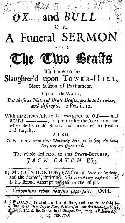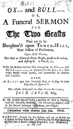 Click Here to View Pages in PDF Format Ox---- and Bull---- or, a funeral sermon for the two beasts that are to be slaughter'd upon Tower-Hill, next session of Parliament, ... By Mr. John Dunton, ... London, printed for the author, and are to be sold by S. Popping, J. Harrison, A. Dodd, and A. Boulter, 1715 [1716]. 43 pages. Notes: vii-viii repeated in page numbering. A satire on Robert Harley, Earl of Oxford and Henry St. John, Viscount Bolingbroke. |