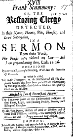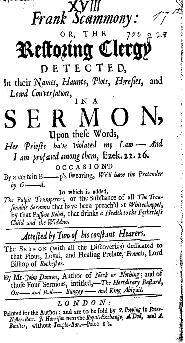 sermon [ Pages 1 - 50 ] [ Pages 51 - 83 ] Frank Scammony: or, the restoring clergy detected, in their names, haunts, plots, heresies, and lewd conversation, in a sermon, ... By Mr. John Dunton, ... London, printed for the author; and are to be sold by S. Popping. J. Harrison, A. Dod, and A. Boulter, [1715?]. 83 pages. |