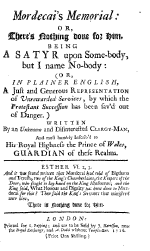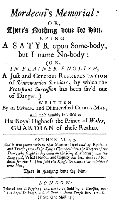 Mordecai's Memorial View Pages in PDF Format [ Pages 1 - 50 ] [ Pages 51 - 71 ] Mordecai's memorial: or, there's nothing done for him. Being a satyr upon some-body, but I name no-body: ... Written by an unknown and disinterested clergy-man, ... London, printed for S. Popping; and are to be sold by J. Harrison, and A. Dodd, 1716. 71 pages. Notes: Dedication signed: Philo-Patris (i.e., John Dunton). |