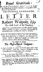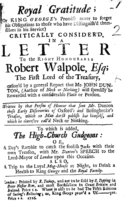 Royal Gratitude View Pages in PDF Format [ Pages 1 - 50 ] [ Pages 51 - 62 ] Royal gratitude; (or King George's promise never to forget his obligations to those who have distinguish'd themselves in his service) critically consider'd. In a letter to ... Robert Walpole, ... Written by that person of honour that sent Mr. Dunton those early discoveries of Oxford's and Bolingbroke's treason, ... To which is added, the high-church gudgeons: ... London, printed by R. Tookey, and are to be sold by S. Popping, 1716. 62 pages. Notes: Signed at end: Philo-Patris, i.e. John Dunton. With an additional titlepage, reading: 'Royal gratitude; or, a letter .. '. With four final advertisement leaves. |