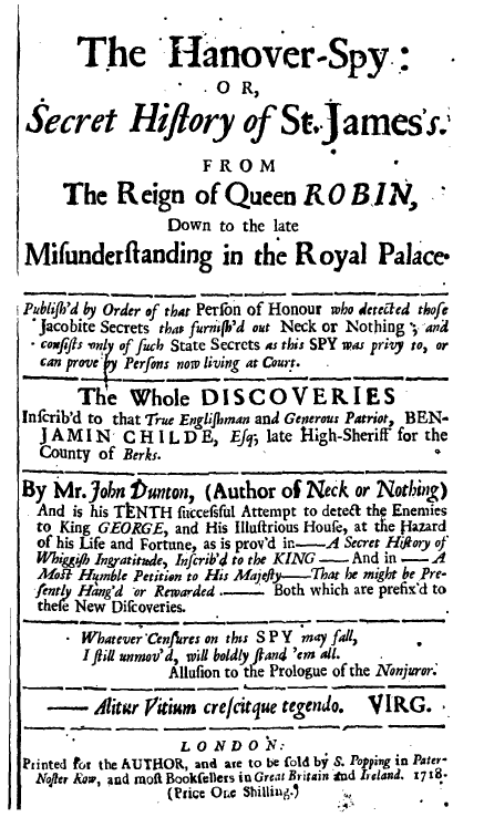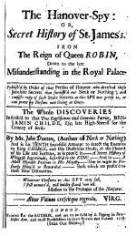 generous patriot, Benjamin Childe View Pages in PDF Format [ Pages 1 - 50 ] [ Pages 51 - 71 ] The Hanover-spy: or, secret history of St. James's. From the reign of Queen Robin, down to the late misunderstanding in the royal palace. Publish'd by order of that person of honour who detected those Jacobite secrets that furnish'd out Neck or nothing; ... The whole discoveries ascrib'd to that true Englishman and generous patriot, Benjamin Childe, ... By Mr. John Dunton, ... London, printed for the author, and are to be sold by S. Popping, and most booksellers in Great Britain and Ireland, 1718. 71 pages. |