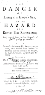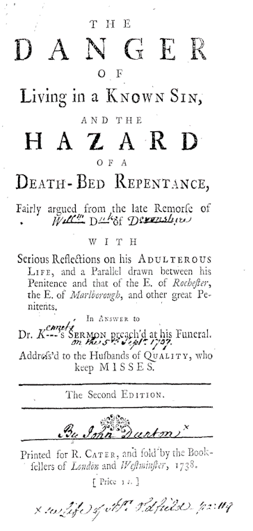 The danger of living in a known sin, and the hazard of a death-bed repentance, fairly argued from the late remorse of W- D- of D-. ... ... In answer to Dr. K---’s sermon preach’d at his funeral. Address’d to the husbands of quality, who keep misses. View Pages in PDF Format [ Pages 1 - 50 ] [ Pages 51 - 61 ] The danger of living in a known sin, and the hazard of a death-bed repentance, fairly argued from the late remorse of W- D- of D-. ... In answer to Dr. K---’s sermon preach’d at his funeral. Address’d to the husbands of quality, who keep misses. NJotes: Printed anonymously by John Dunton. An abridged version of ’The hazard of death-bed-repentance’, an answer to ’A sermon preach’d at the funeral of .. William, Duke of Devonshire, .. ’ by White Kennet. The second edition [London], 1738. 61 pages. |